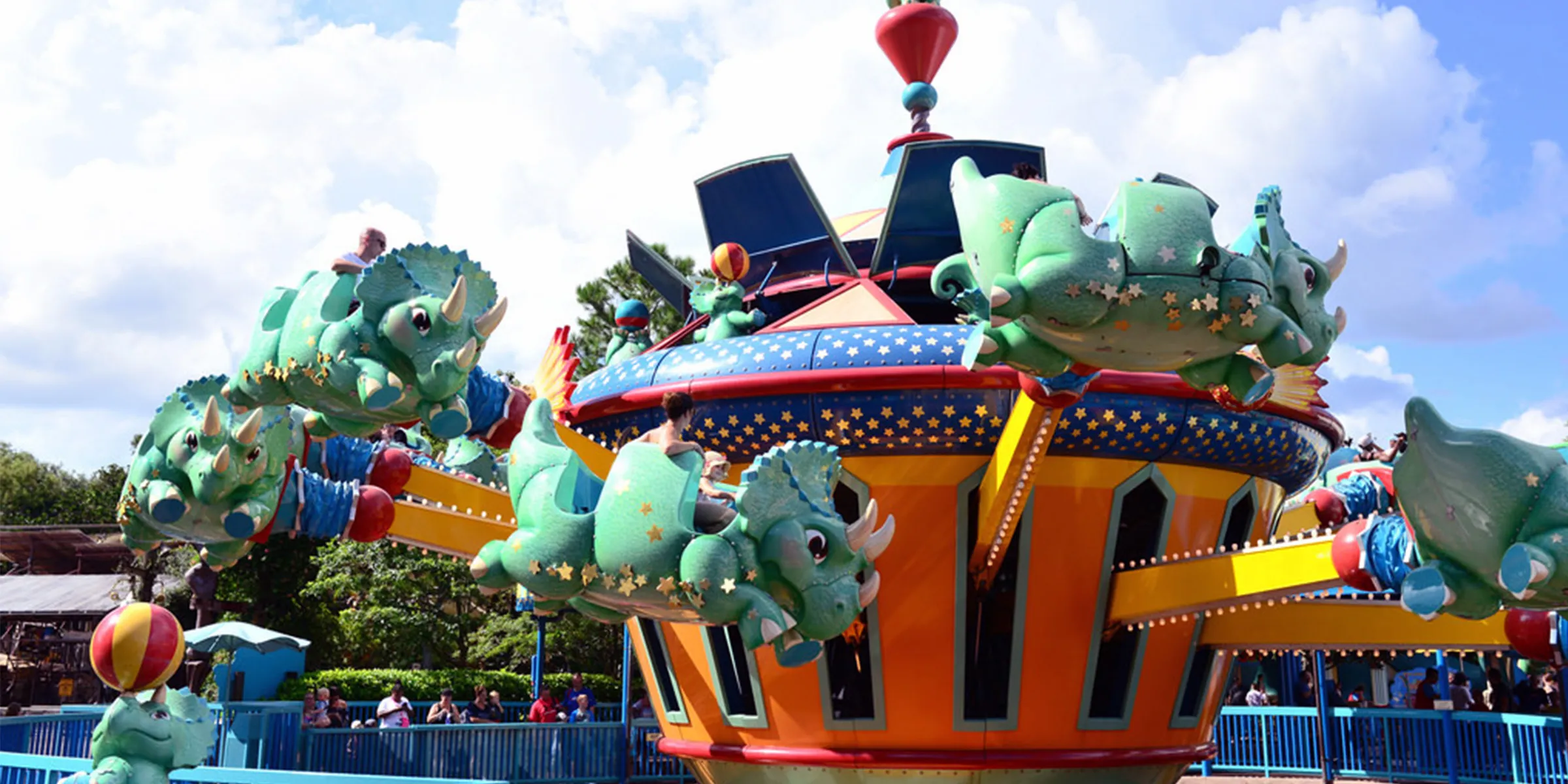 Atracción giratoria estilo Dumbo con dinosaurios.