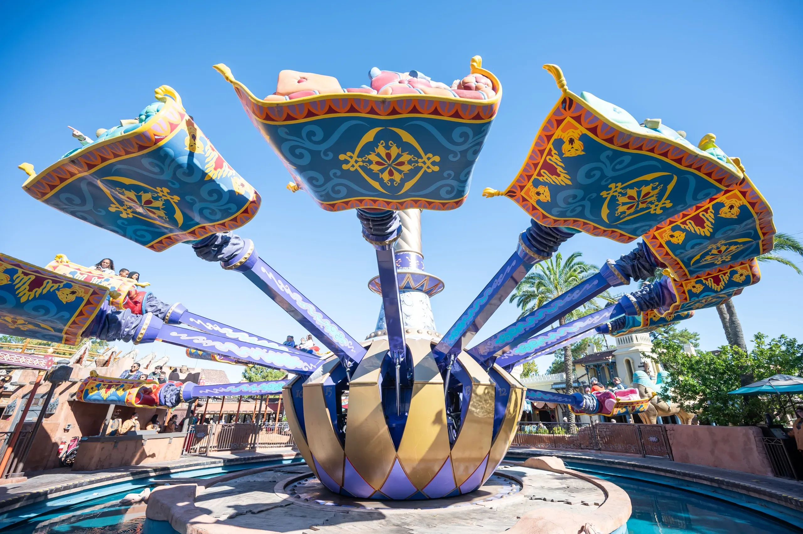 Version tematica de Aladdin del clasico Dumbo: alfombras voladoras que suben, bajan e inclinan. El de adelante controla la altura, el de atras la inclinacion.