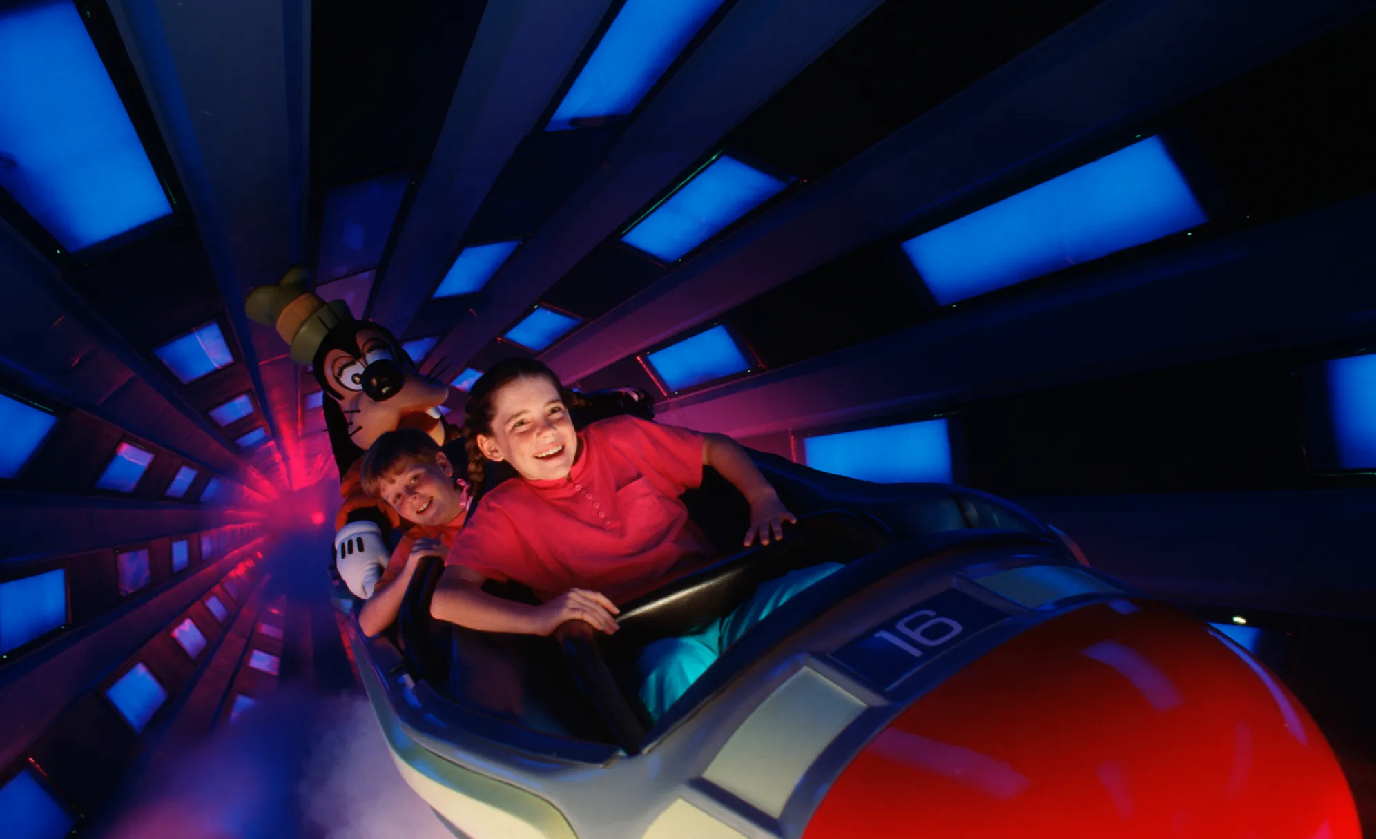 Montana rusa en completa oscuridad dentro de una estructura en forma de cono que simula el espacio exterior. No ves absolutamente nada de la pista, lo cual amplifica cada giro y bajada. Tiene 2 pistas paralelas (Alpha y Omega) y la fila interactiva con juegos espaciales es excelente.