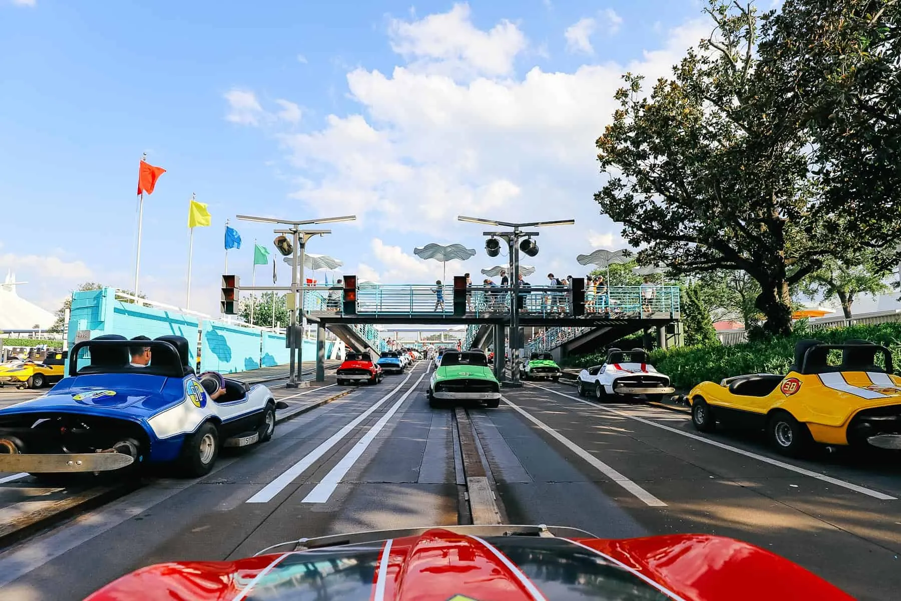 Los autos van guiados por un riel central — no podes salirte de la pista.